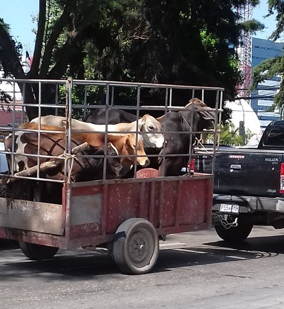 Unas reses son transportadas en una carreta jalada por un picop. Esta imagen fue captada en la capital.
