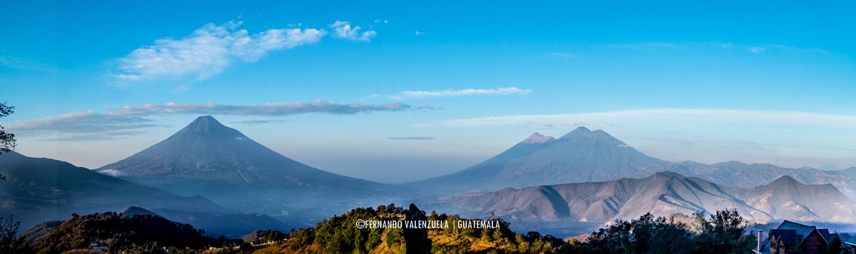 Un cielo celeste acompaña a los volcanes de Agua, Fuego y Acatenango desde Hobbitenango en aldea El Hato, Antigua Guatemala