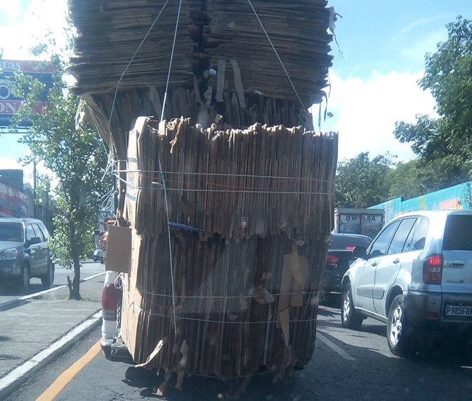 Apenas se ve una luz trasera de este picop que transporta una enorme cantidad de cartones, en una de las calles de la ciudad. La pregunta es si esto está permitido y qué tipo de sanción deberían de aplicar las autoridades.