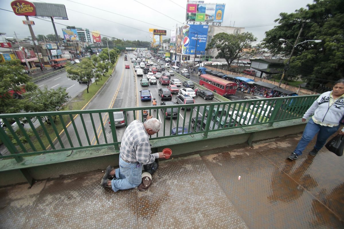 Un hombre de la tercera edad apela a la misericordia de los transeúntes, en una de las pasarelas de El Trébol, zona 7. Al fondo, el denso tránsito del comienzo de la jornada en la capital.