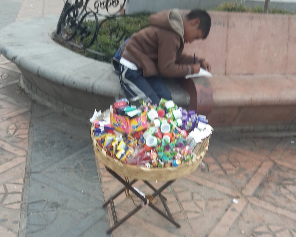 Este niño no solo vende productos en el parque de San Pedro Sacatepéquez, San Marcos, sino estudia y busca cumplir sus sueños.