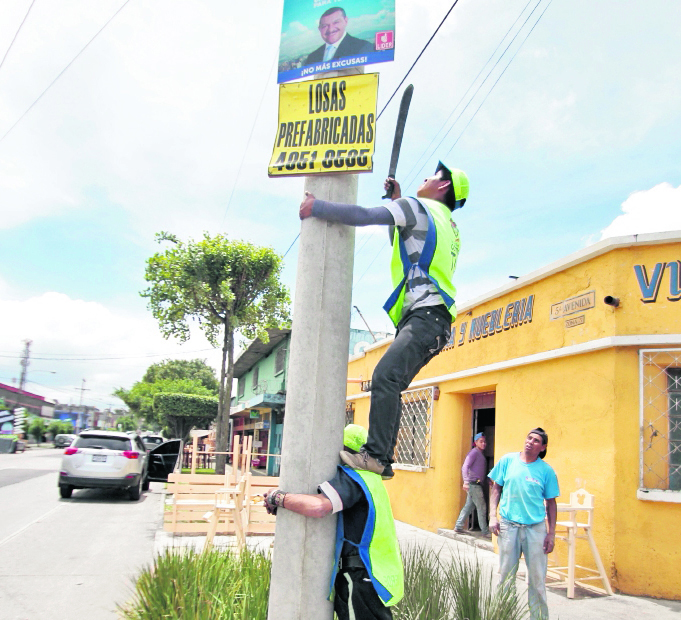 Trabajadores municipales se las ingeniaron para retirar propaganda electoral en la 35 calle y 10a. avenida, zona 3.