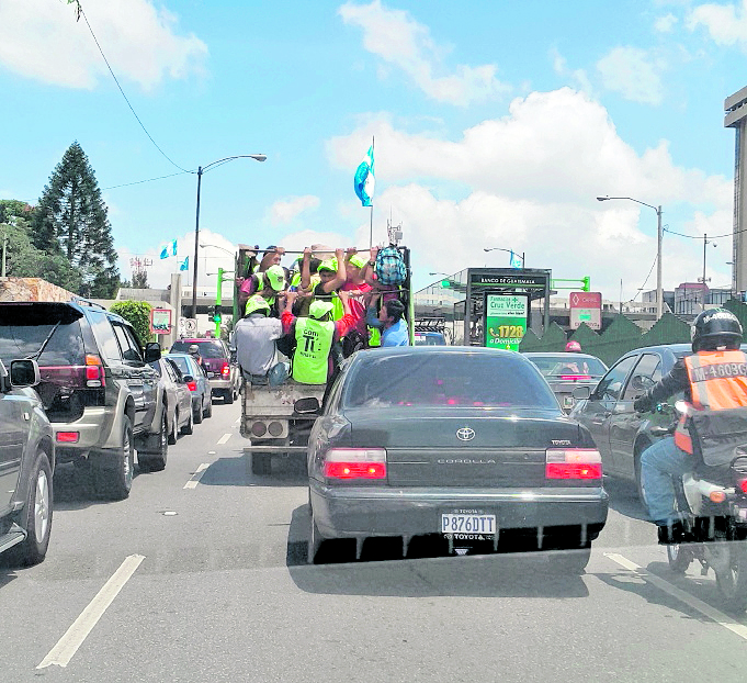 A veces la necesidad de transporte obliga a las personas a viajar de manera arriesgada por el tráfico de la Ciudad de Guatemala.
