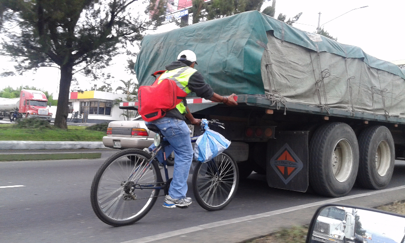 Debido al tráfico que agobia a la capital, un ciclista aprovechó el “jalón” al sujetarse de un camión para avanzar sin problemas.