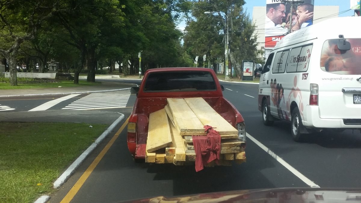 Un picop que transporta tablas puso en riesgo a los demás conductores, ya que apenas portaba una playera como signo de precaución.