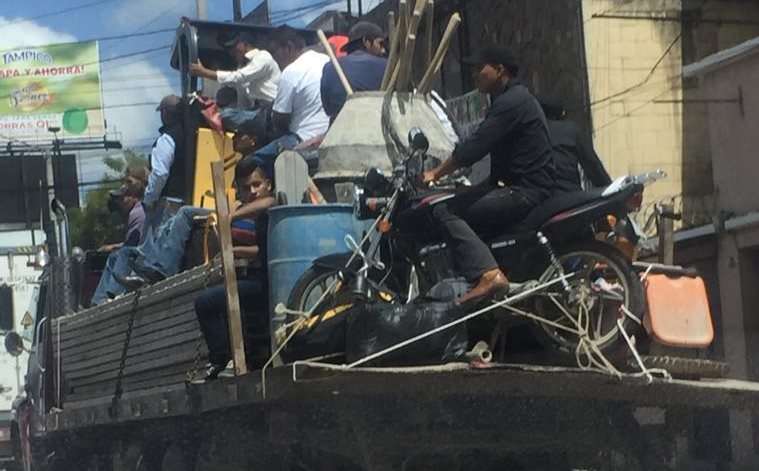 Este camión es una auténtica obra rodante. Van acomodados los materiales de construcción, las herramientas de mano, un montacargas, una mezcladora de concreto, por lo menos nueve  obreros y hasta la moto para regresar a casa.
