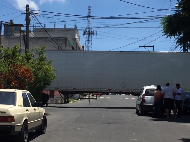 Un tráiler estacionado en medio de la calle bloqueó el paso vehicular por horas para poder descargar la mercadería en la zona 2 de Mixco, sin tener respeto por los vecinos.