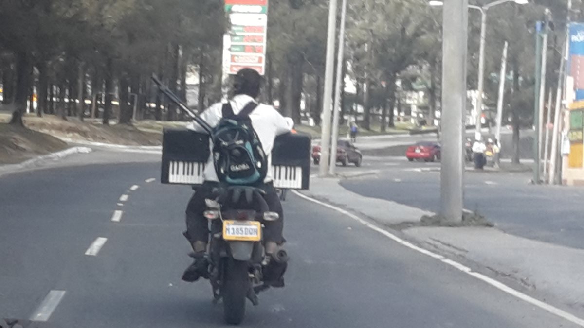 Quizás ya ha visto a varios motoristas transitar por las calles sin chaleco o sin casco protector, pero no es muy común ver a uno que viaje con un teclado entre sus brazos y piernas. Esta curiosa imagen fue tomada por un lector, cuando circulaba por el Periférico. ¿Riesgoso? ¿Usted qué piensa?