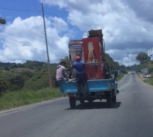 El espacio no fue suficiente y estas dos personas no pudieron ir en un lugar seguro en el traslado de cámaras de refrigeración en la ruta entre Cuilapa y Barberena.