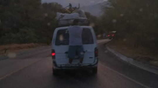 Un lector captó, en la carretera que conduce a Usumatlán, Zacapa, cómo una persona arriesgó su vida al viajar de pie en la parte trasera de un microbús.