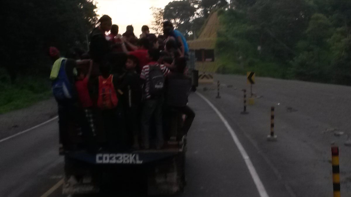 Niños se exponen al peligro, al viajar en un picop sobrecargado, en la carretera a Río Bravo, Suchitepéquez.
