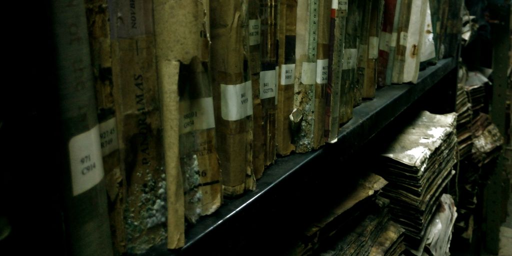 Hoy, la humedad sigue causando estragos. Sobre el lomo y portada de varios tomos sobresale moho. Los libros ya no están clasificados y muchos otros documentos están apilados sobre dos escritorios.