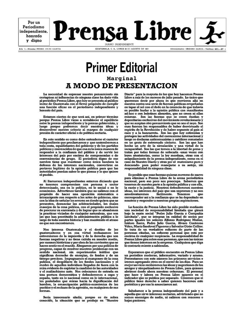 “La necesidad de expresar nuestro pensamiento sin cortapisas ni influencias de ninguna clase ha dado vida al periódico Prensa Libre, que hoy se presenta al público lector de Guatemala con el firme propósito de cumplir una función eficaz en el periodismo independiente y honesto del país”: primer párrafo del primer editorial, publicado el 20 de agosto de 1951.