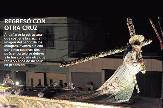 Luego de una larga espera le colocaron otra cruz, la que luce en su camarín y es más liviana. Esa vez la procesión ingresó a su templo casi a las cuatro de la mañana.