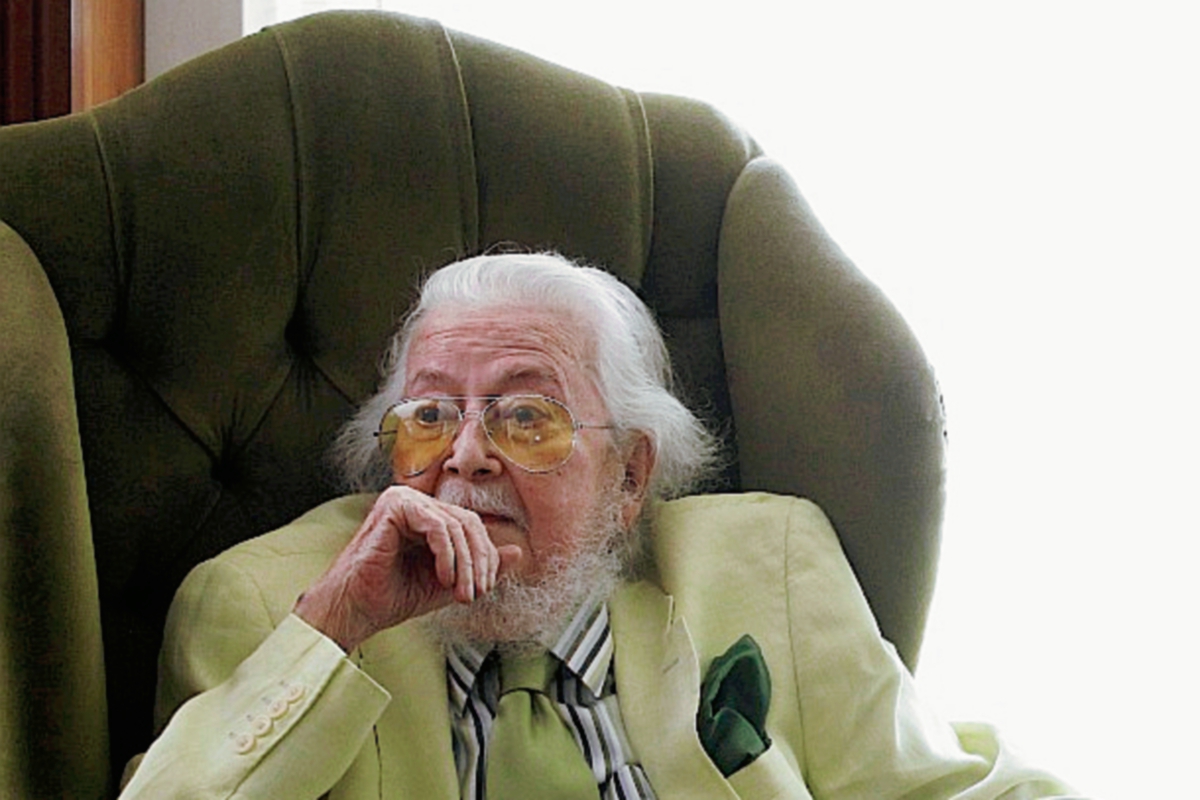 Nacido en Ciudad de México el 1 de abril de 1935, Del Paso viste un saco de lino de color pistacho, a juego con su corbata, unos elegantes zapatos de dos tonos y lentes de cristal amarillo.