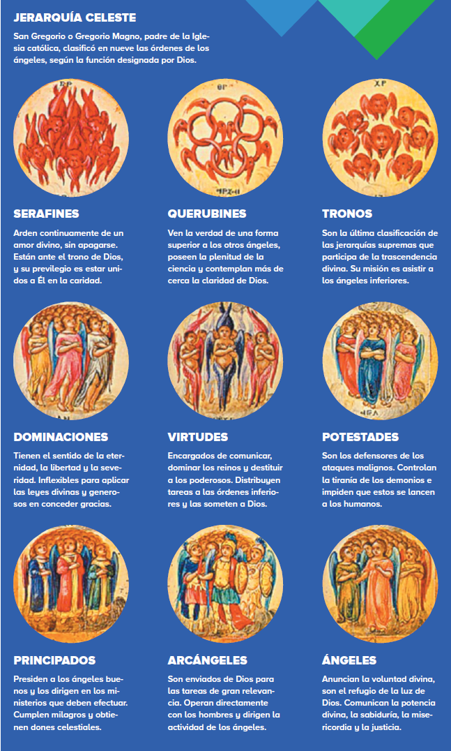 En la publicación Acerca de la jerarquía celeste, escrita a inicios del siglo VI, se establecen coros angélicos distribuidos en tres órdenes: consejeros (serafines, querubines y tronos), gobernadores (dominaciones, principados y potestades) y ministros (virtudes, arcángeles y ángeles).