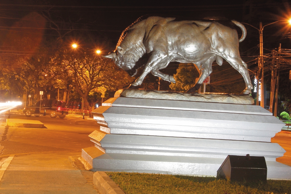 Primero está un toro de bronce que, al estar parado frente a él se percibe su gran dimensión —es mucho más grande de lo que se ve desde la ventanilla de un automóvil—. A un costado, sobre la banqueta que divide la avenida principal con el carril auxiliar, se aprecian dos jabalíes que luchan ferozmente. Cerca está un león que domina a un cocodrilo, y una leona que acecha una presa, quizás al ciervo atorado en una rama que está en frente.