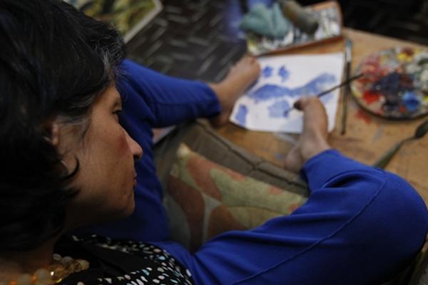 Desde los 12 años se dedica a pintarcon los pies y boca, debido a una parálisis cerebral.