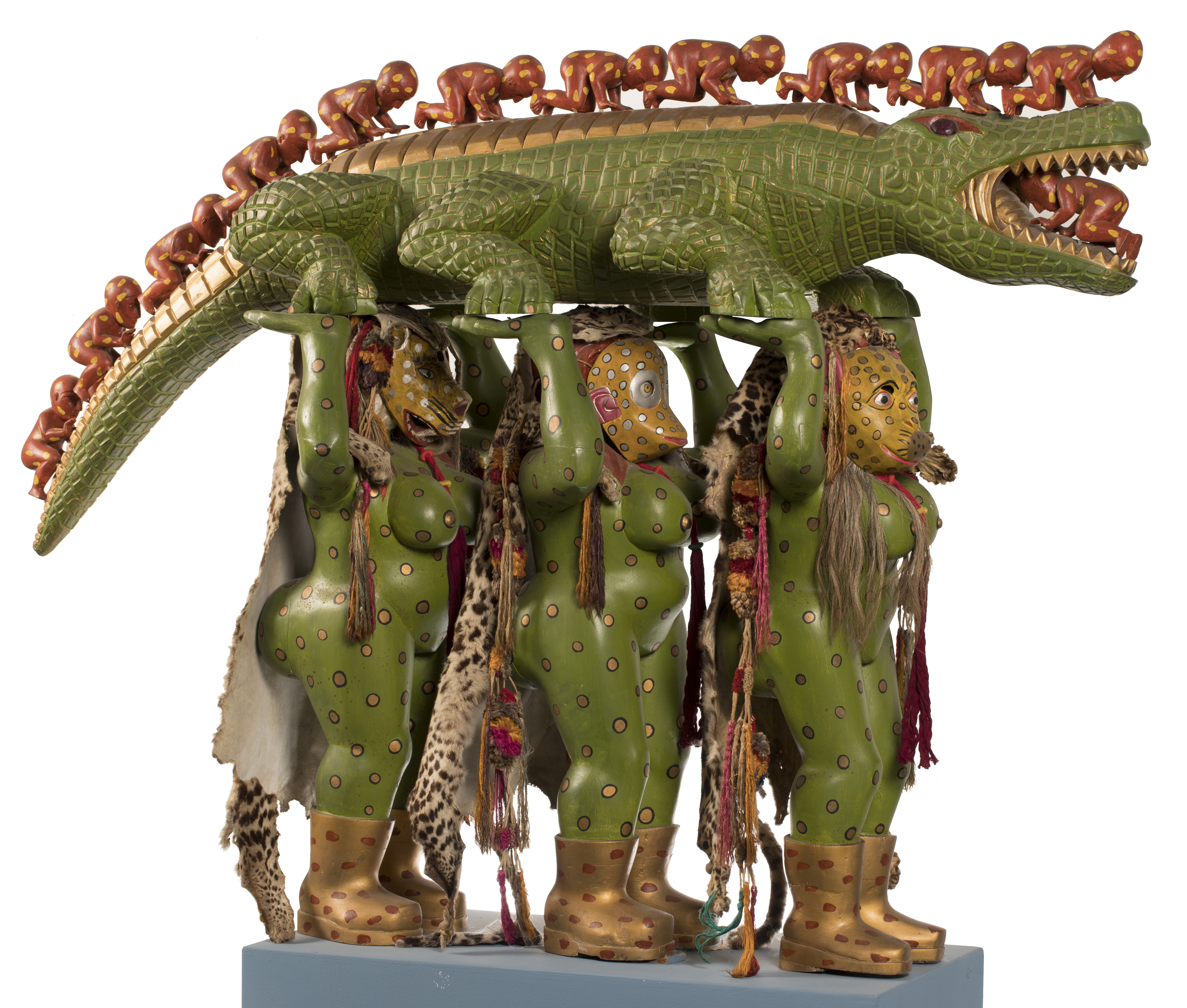 Las cincuenta piezas que compusieron la obra fueron talladas por artesanos de Antigua Guatemala, quienes siguieron los conceptos de Azurdia, quien ensambló y pintó los elementos con colores brillantes. Eran alusivas a las danzas tradicionales, pero con un significado nuevo. Las decoró con pieles de animales, lazos, flecos y algunas frutas. Tal y como se menciona en el catálogo Todo es Una, esta acción “era un juego de identidades entre la simbología”. Pero lo que más destaca de la obra es la personificación de cada pieza de madera. Todas son mujeres en alguna acción, dentro de una línea de realismo mágico. Una de las piezas, Las bananeras, alude a la dura vida que atraviesan las mujeres en el campo, pero sin duda la más emblemática de la serie sea El cocodrilo: un gran reptil verde y dorado con seis patas y que es cargado por tres mujeres quienes visten tocados de textiles y tienen el rostro cubierto. En el suelo de la escena gatean bebés por el lomo del reptil, desde la cola hasta las fauces abiertas.