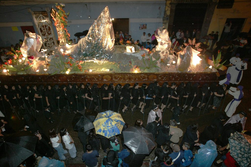 Ni Jesús del Consuelo se libró de los torrentes aquel sábado de abril del 2003. Recuerdo que las andas representaban la octava estación del vía crucis. De las mujeres, las azucenas de papel y el musgo, solo quedaron vestigios y destrozos causados por el viento y el granizo. La lluvia hizo añicos el adorno, y los focos estallaron al contacto del agua. No hubo tales de seguir el orden del recorrido. Jesús y sus acompañantes corrieron empapados de regreso a La Recolección. Ni las partituras de los músicos se libraron del chubasco.