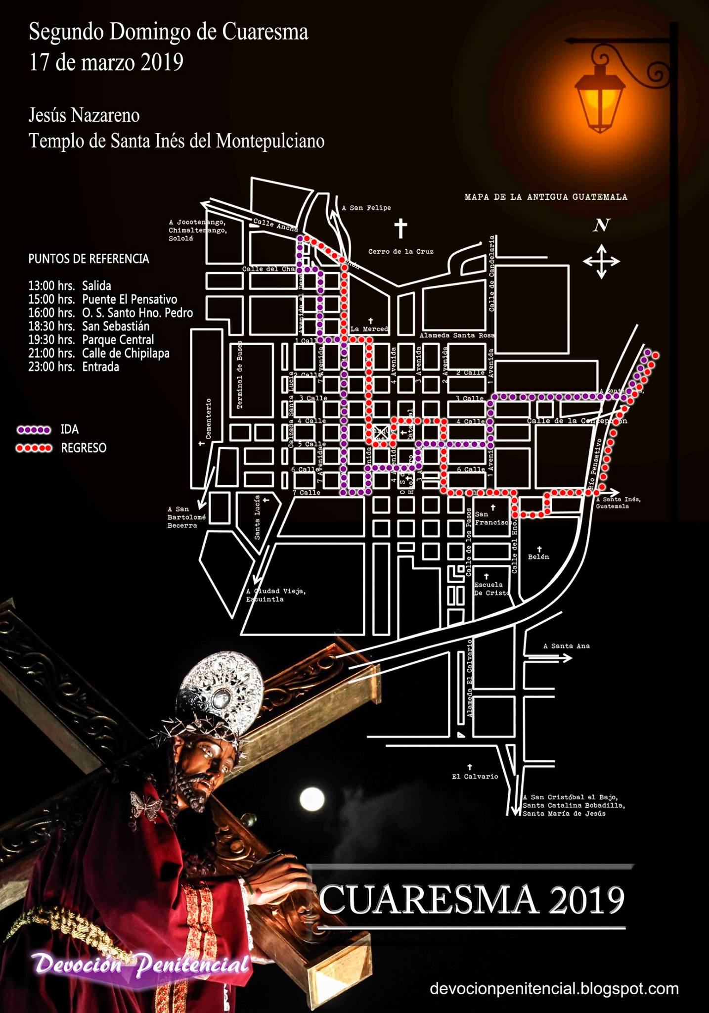 - Antigua Guatemala – Procesión de las veneradas imágenes de Jesús Nazareno y Virgen de Dolores. Aldea de Santa Inés del Montepulciano. Salida: 13 horas. Entrada: 23 horas.