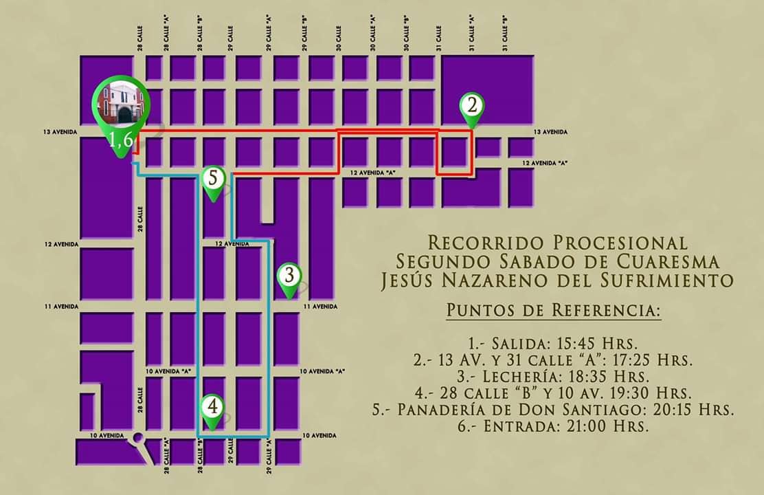 - Ciudad de Guatemala – Procesión de la venerada imagen de Jesús Nazareno del Sufrimiento. Parroquia Santa María Goretti, colonia Santa Fe, zona 13. Salida: 16 horas. Entrada: 21 horas.
