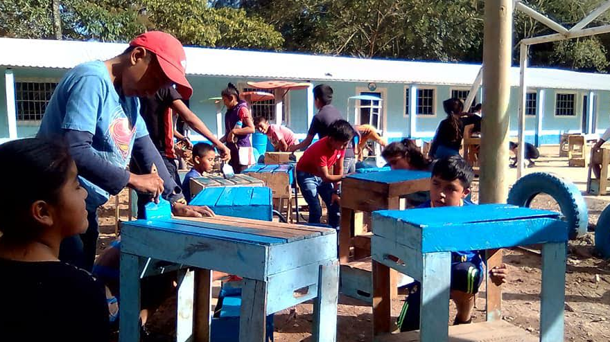Niños estudian sobre cajas para verdura, maestro pide apoyo para obtener mobiliario