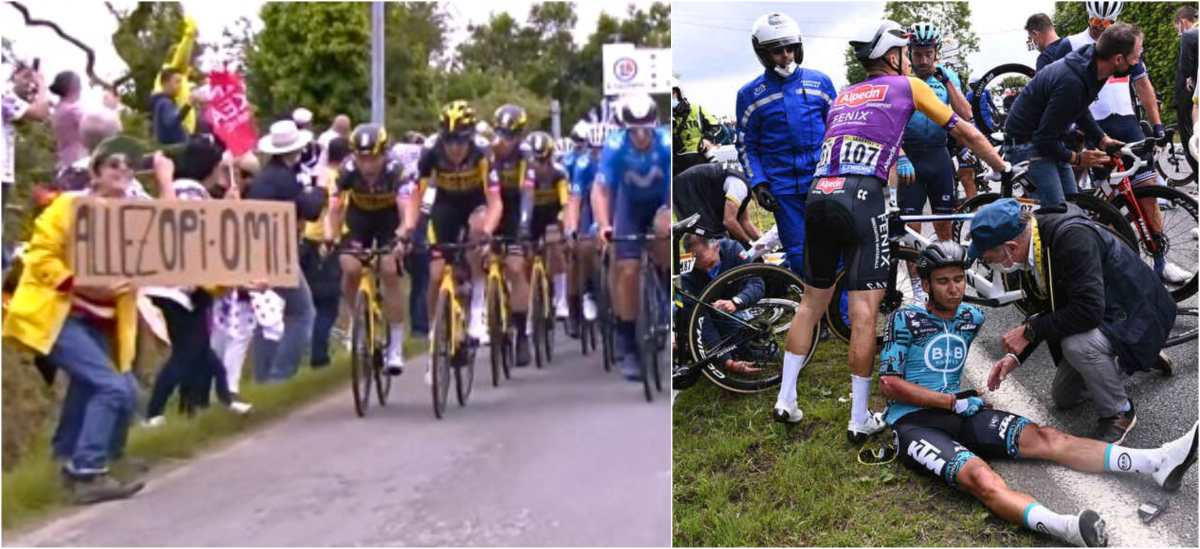 Aficionada con pancarta provoca una terrible caída en el inicio del Tour de Francia