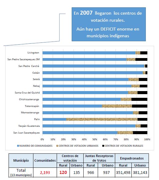 Estos municipios reúnen 2 mil 193 comunidades. Según apunta el estudio, aún hay un déficit entre el número de comunidades identificadas en estos municipios y la instalación de centros de votación rurales, los cuales a penas comenzaron a implementarse en el 2007.