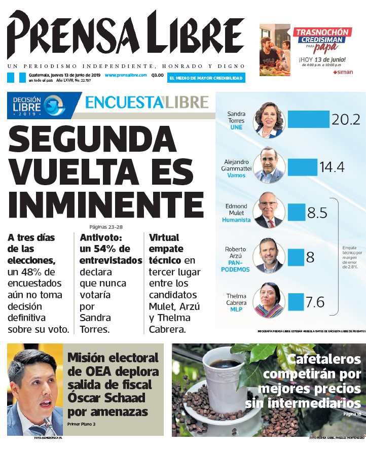 No se planteó un escenario de segunda vuelta entre Torres y Thelma Cabrera, del Movimiento de Liberación de los Pueblos (MLP), debido a que Cabrera no figuraba entre los punteros en la primera medición, publicada a inicios de abril pasado.