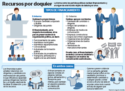 Eso también implica asambleas y actividades de formación política y afiliación. Además, se define el financiamiento interno, proporcionado por miembros del partido, y el externo, que viene de actores individuales afuera de la agrupación o empresas.