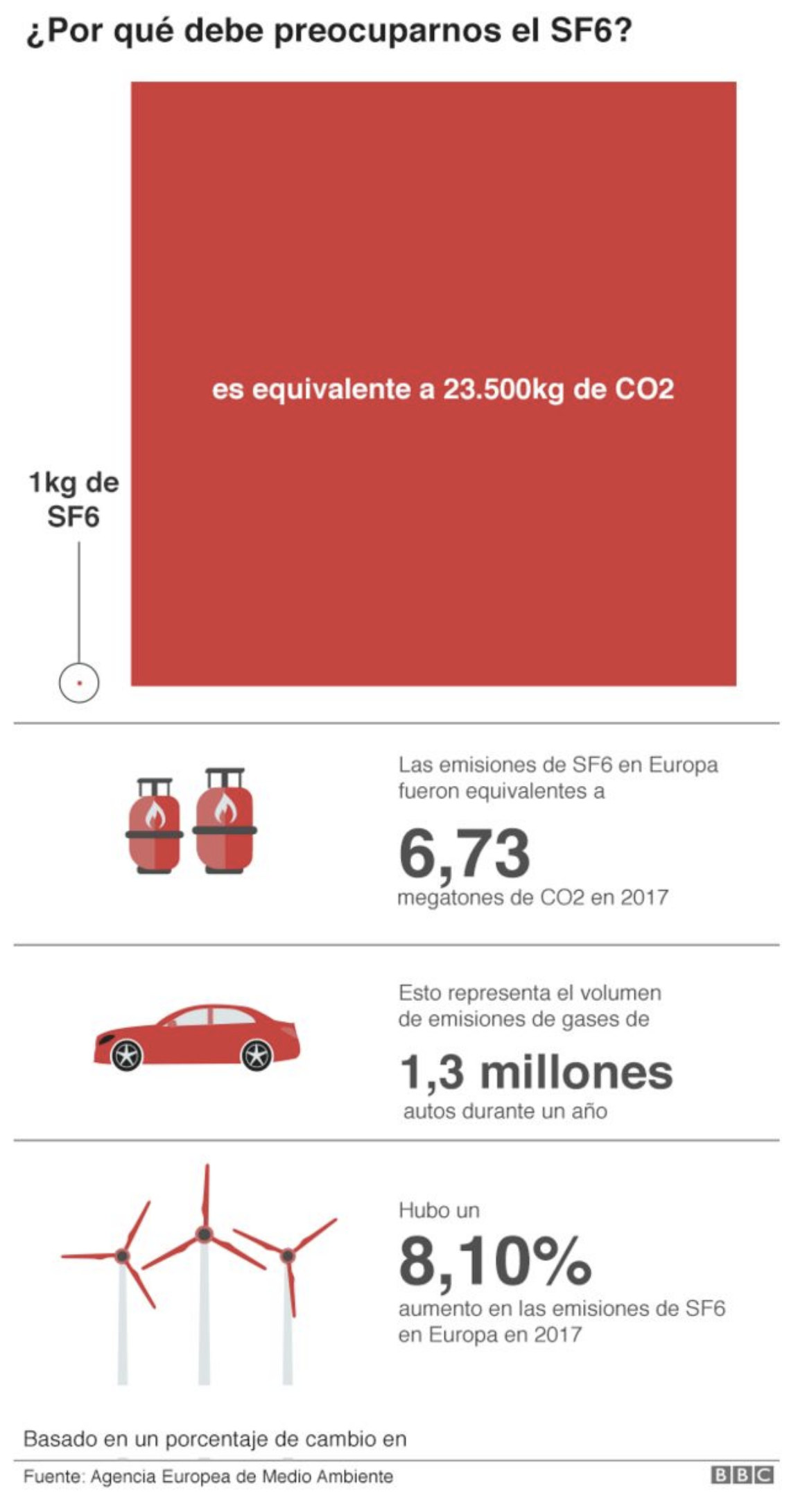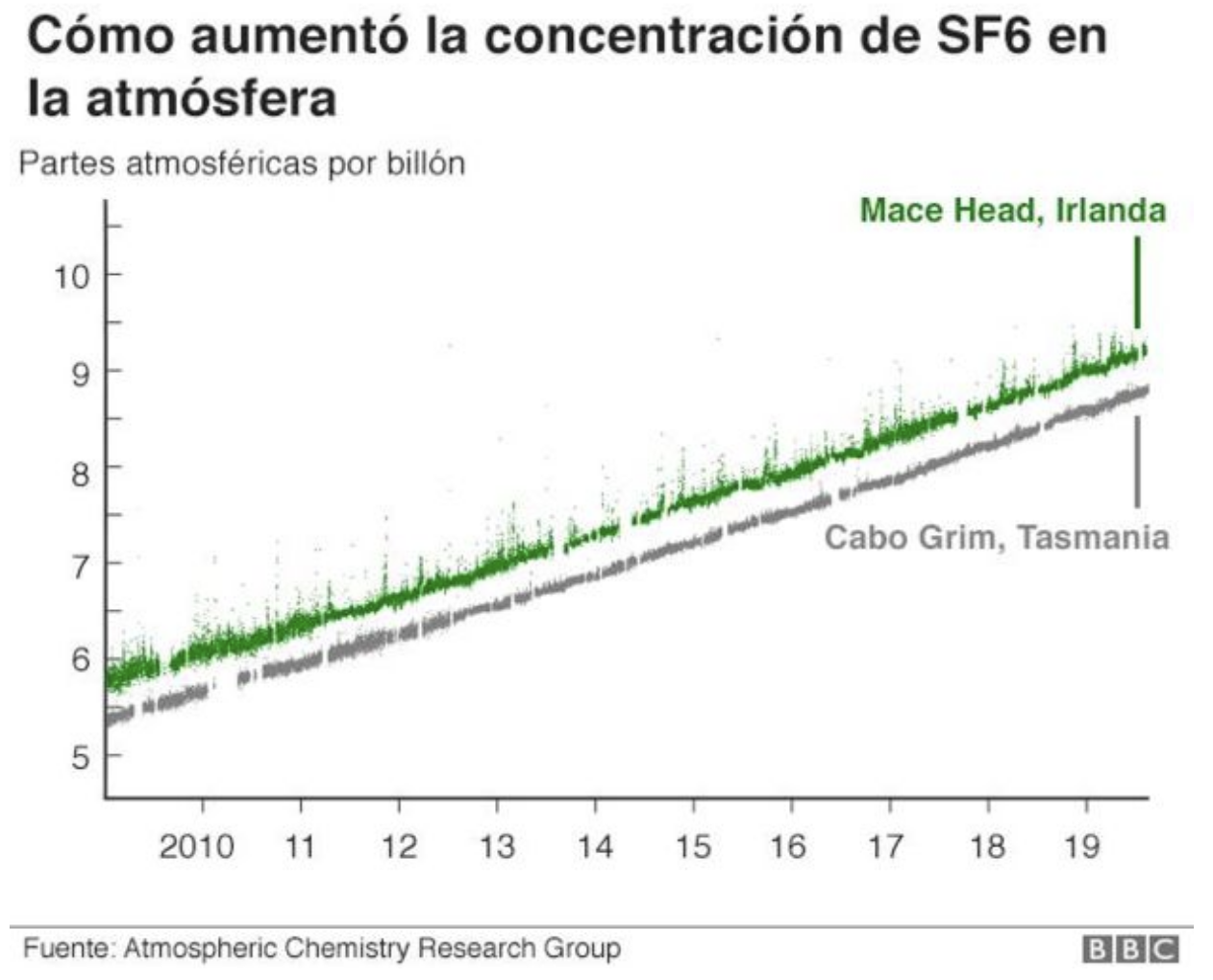 El SF6 produce un efecto de invernadero 23.500 veces mayor que el dióxido de carbono o CO2.
