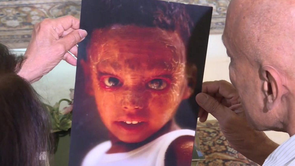 “Vimos a esta niña pequeña que estaba realmente en muy mal estado. No tenía párpados, sus ojos sangraban, su piel estaba en una terrible condición. Y recuerdo claramente que nuestra segunda hija la levantó, la abrazó y dijo: ‘Mamá, llevémosla a casa'”, le cuenta a la BBC Aloma Lobo, la madre adoptiva de Nisha.
