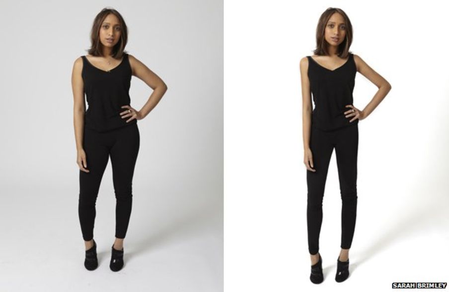 La periodista de la BBC Tulip Mazumdar asistió asombrada a la modificación digital de su imagen original (a la izquierda). Ver el resultado y hacer la comparación le hacía verse "mayor y cansada", dijo. (Sarah Brimley).