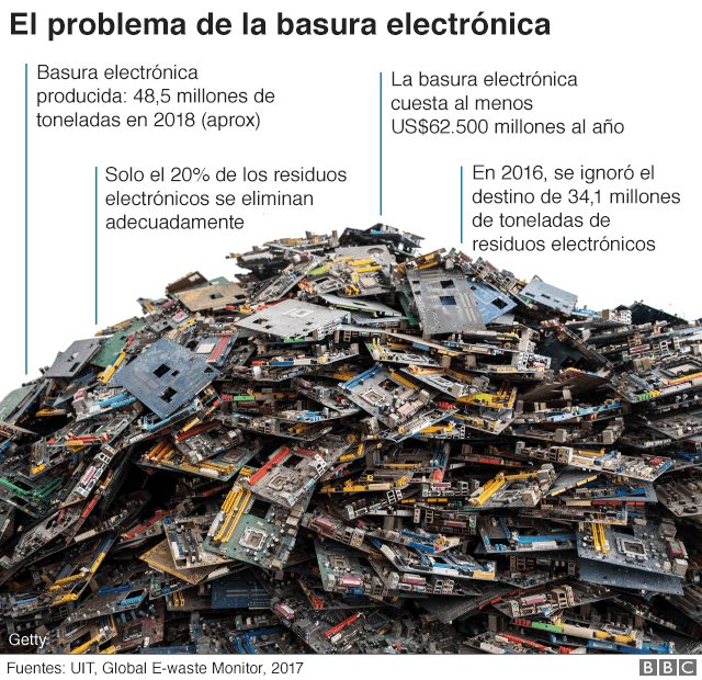 Se calcula que la chatarra electrónica del mundo contiene más de US$62.500 millones en materiales preciosos como oro, cobre y hierro, según datos de 2016 correspondientes al informe Gobal E-waste Monitor (publicado en 2017).