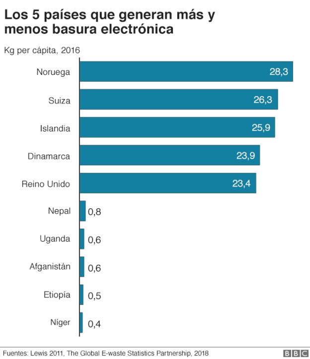 Sin embargo, los 1.200 millones de habitantes de todo el continente africano tan solo generan un promedio de unos 1,9 kg de basura electrónica por persona, cada año.