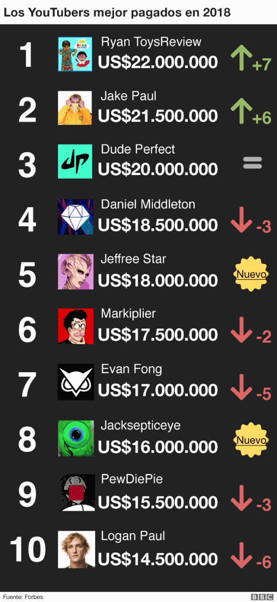 Pero ¿quiénes comparten la lista con Ryan en YouTube? Estos son los “youtubers” que más ganaron en 2018, según la revista Forbes.