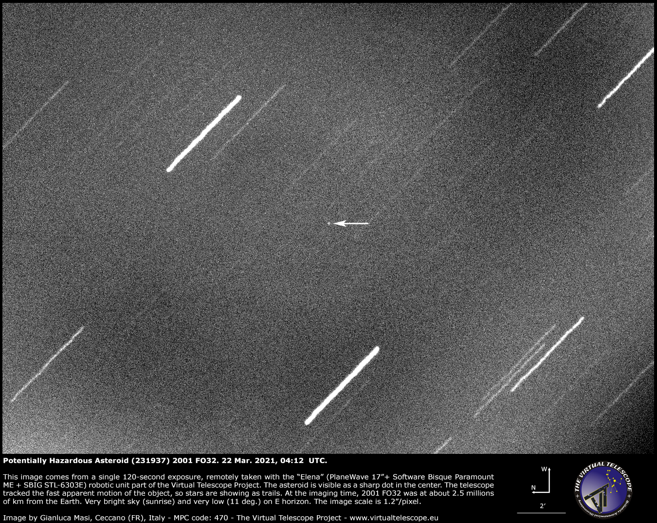 Bautizado 2001 FO32 y de menos de un kilómetro de diámetro, el objeto pasó a 124 mil km/h, según la NASA. El canal YouTube del Virtual Telescope Project mostró una imagen granulada con un pálido punto.