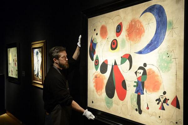 La obra L’oiseau au plumage deploye vole vers l’arbre argentee, del artista español Joan Miró, en la casa de subastas Christie’s, en Londres. (Foto Prensa Libre: EFE)