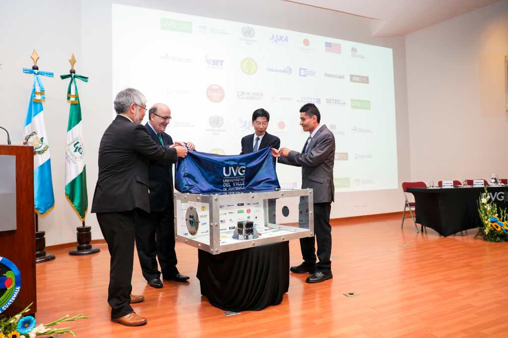 Momento de la develación y entrega del satélite Quetzal 1 a la Agencia de Exploración Aeroespacial de Japón (JAXA) #Quetzal1#CubeSatUVG#InnovaciónUVG@UNOOSA@JAXA_JP@QUETZAL1_UVG pic.twitter.com/X0uGzEpTbY