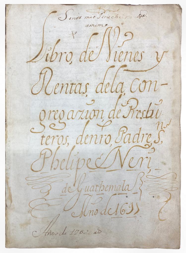 Libro de inventarios de la Congregación del Oratorio de San Felipe Neri, en Santiago de Guatemala, de 1697, donde aparece la imagen de Jesús Nazareno de las Tres Potencias. (Foto Prensa Libre: cortesía de Alejandro Cóbar)