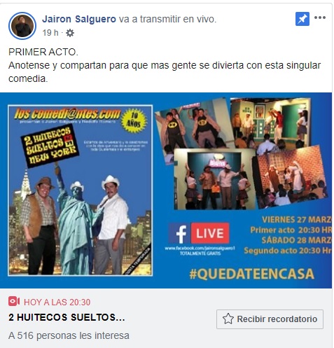 Mientras que el comediante Jayron Salguero ofrece, también en su página de Facebook, transmisiones en vivo con contenido variado como el primer acto de su obra Dos Huitecos Sueltos en Nueva York o también monólogos al estilo podcast en los que aborda varios temas.