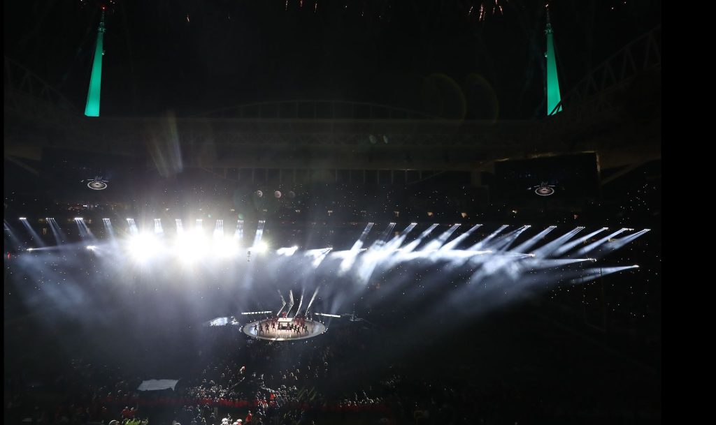 Shakira, de rojo, se lució con sus bailes y coreografías, y tuvo de invitado al reguetonero Bad Bunny, lo cual fue una sorpresa anunciada horas antes. La colombiana interpretó Loba, Ojos así, Suerte y con Bad Bunny cantaron I like it y un remix de Callaíta, Puro Chantaje y Hips don´t lie.