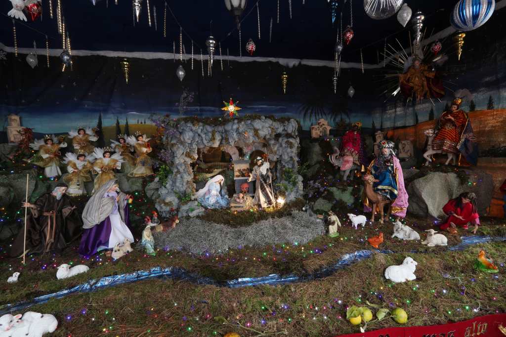 El belén mide aproximadamente tres metros de fondo por cinco de largo, y ha ido creciendo con los años. Lo complementa con piezas como el Padre Eterno, los Reyes Magos, pastores, ovejas y elementos que se encuentran en los mercados navideños de Xela. Este año, le tomó a la familia tres semanas elaborarlo, e incursionó en el uso de tecnología al montar un río con peces reales, una chimenea que acoge al Niño Jesús y una conexión eléctrica de luces combinada con tela.