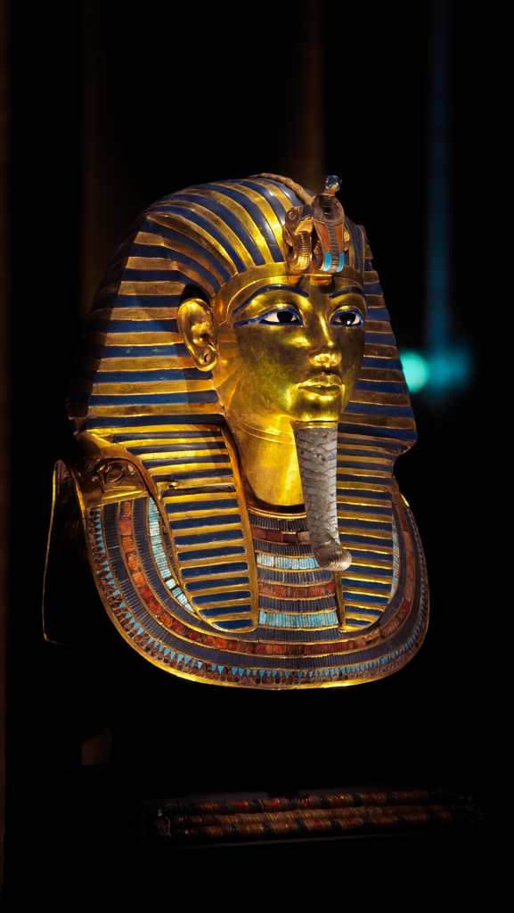 Máscara fúnebre de oro puro, encontrada en la tumba de Tutankamón y que se exhibe en el GME, como la pieza estrella. (Foto Prensa Libre, Shutterstock)