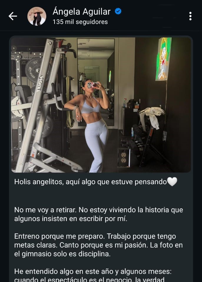 Sin embargo, pasadas las 17.00 horas del 3 de marzo, Ángela Aguilar desmintió el rumor de su retiro y destacó que atraviesa un proceso personal para cuidarse a sí misma.