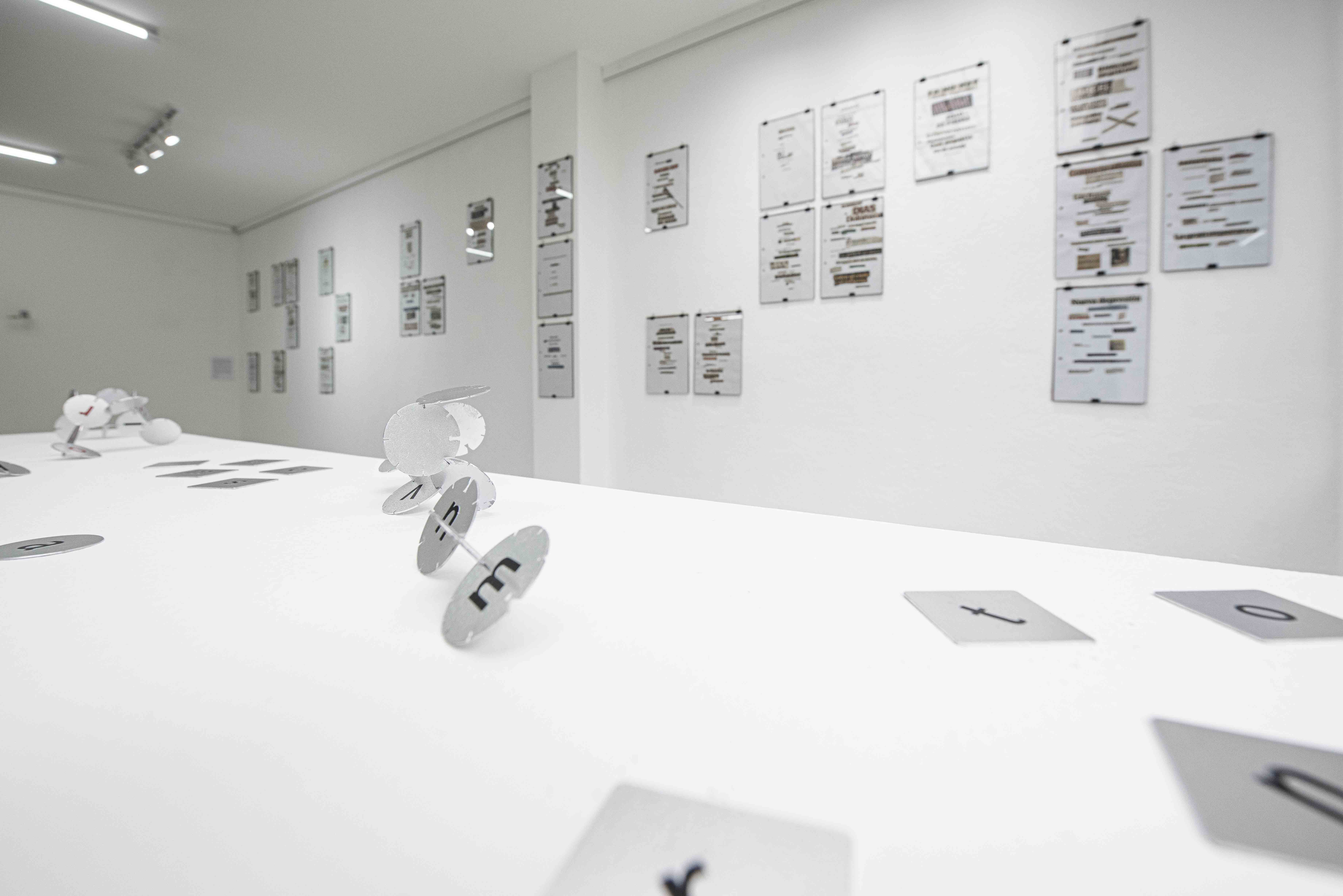 En una mesa, y dispersas, destacan algunas letras en placas metálicas que corresponden a la obra Atómica, signada por el artista visual y poeta de San Andrés Xecul (Totonicapán), Manuel Tzoc. Cada una se concibe como un átomo, “pieza fundamental para completar un lenguaje”, según explica el artista. Su propuesta es una metáfora a la fracturación del sujeto a la hora de escribir poemas y esculpir las palabras.