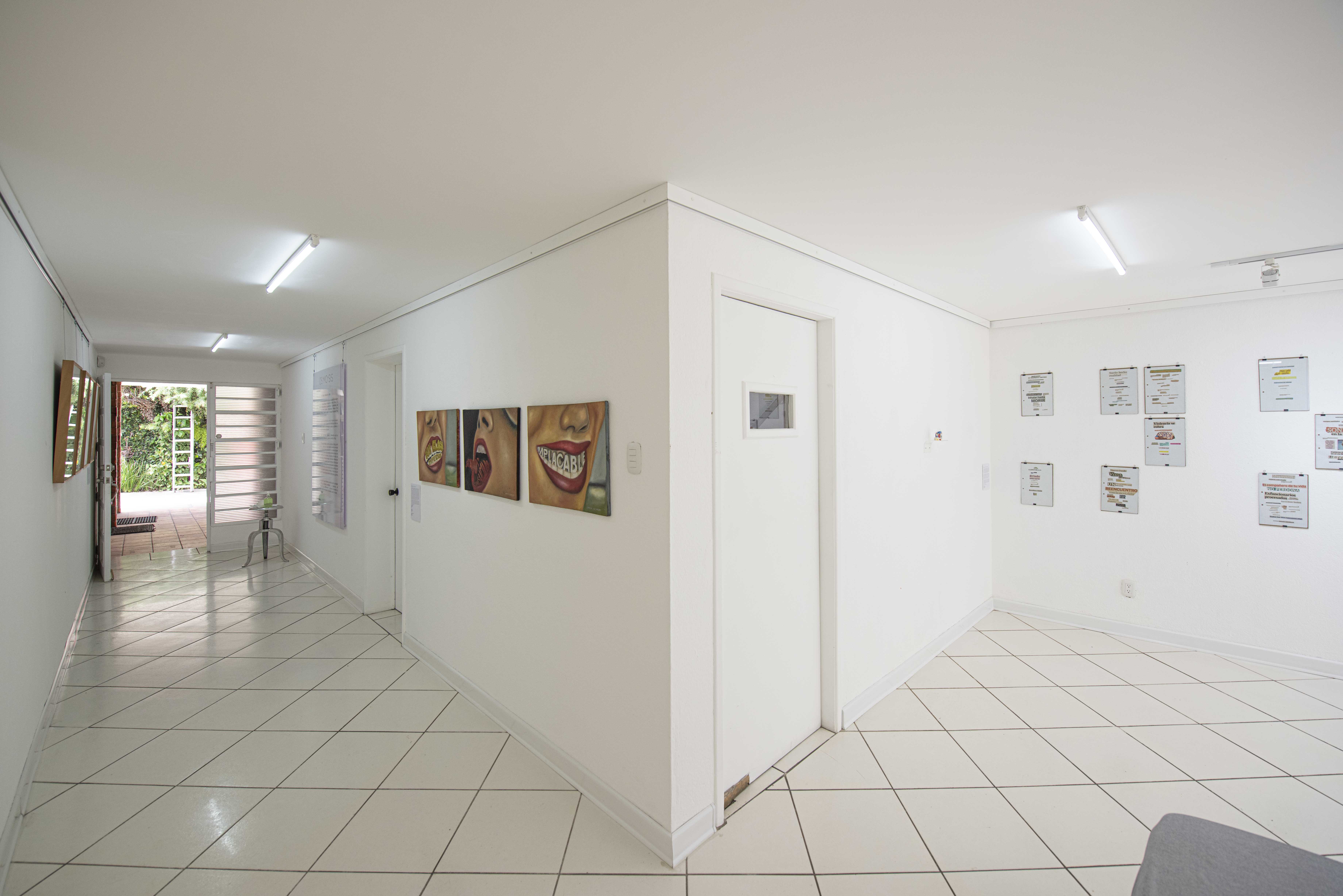 Atrás, en una de las paredes, se aprecian las bocas pintadas por el artista nacional Erick Boror de la serie IMPLACABLE. Varios cuadros al óleo muestran una risueña y coqueta facción que es complementada con palabras como “IMPLACABLE” y frases como “CON CLASE ESPECIAL” Y “PECADOS CONSUMADOS”.