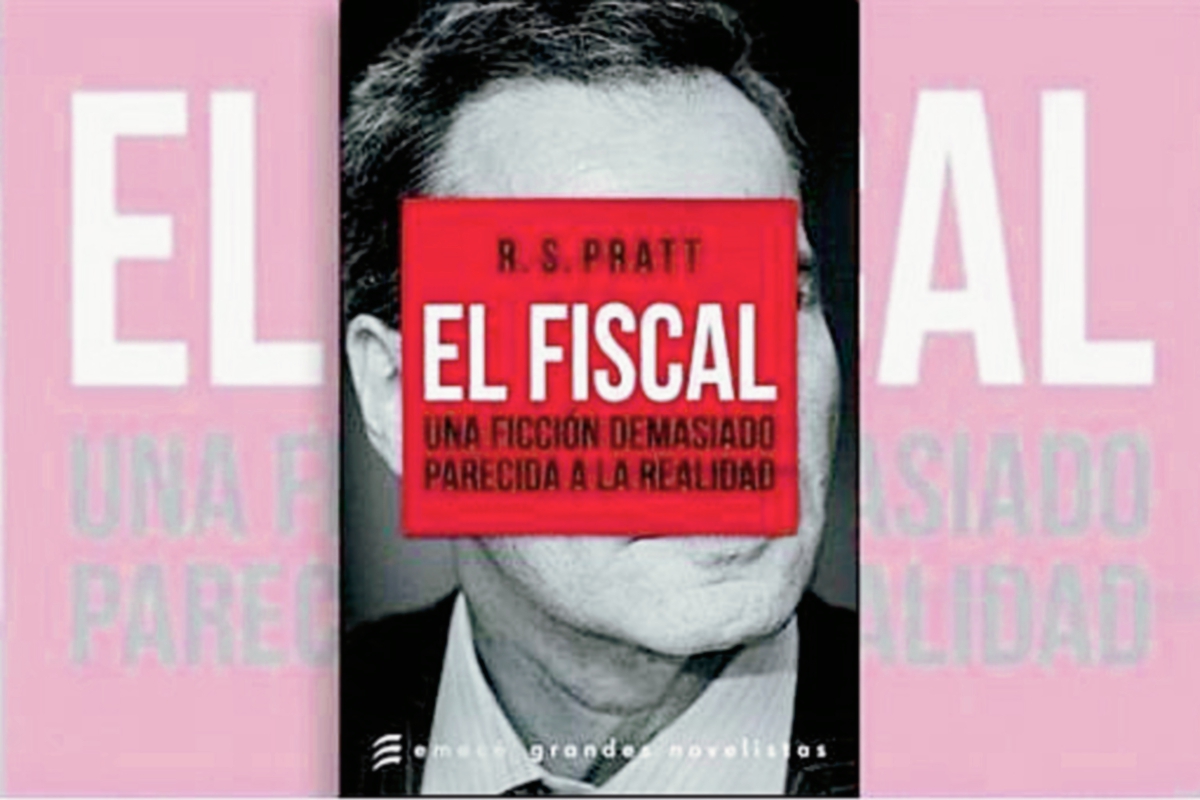 “El fiscal. Una ficción demasiado parecida a la realidad”, es el título de la novela escrito sobre un fondo rojo que cubre parcialmente el rostro del fiscal fallecido.