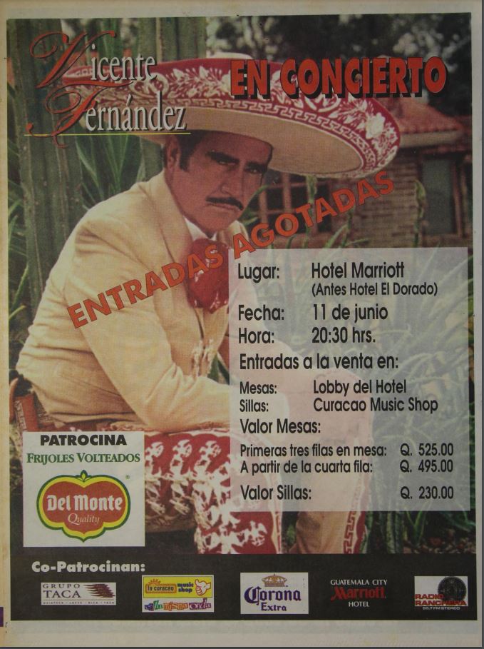 Acompañado siempre por sus mariachis y bajo el lema “Mientras ustedes aplaudan, su Chente seguirá cantando” deleitó en varias ocasiones a su público guatemalteco, quien siempre lo acompañó con aplausos y coreando su amplio repertorio de canciones.